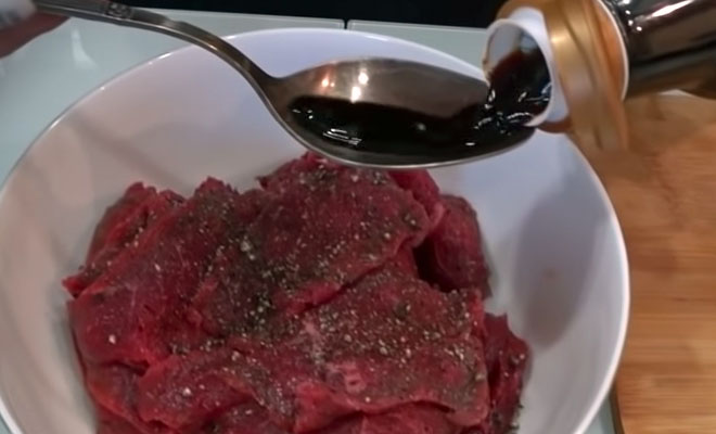 Как только мясо нарезано, переходим к маринадо. Его основа будет из соевого соуса.