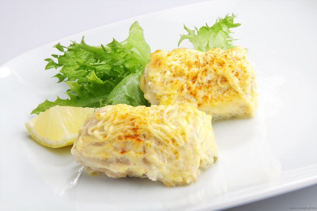 Затем нужно выложить фарш на рыбное филе и свернуть его в рулетики. Затем сложить рулетики из рыбного филе в огнеупорную форму, залить их молоком с лимонным соком (сока добавляйте по своему вкусу) и тушить в духовке 20 минут при 220-240°С.