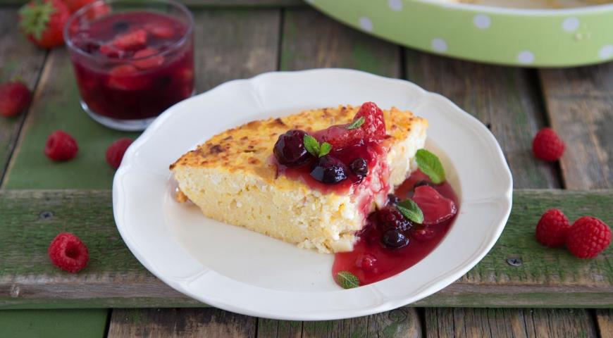 Готовый крупеник выньте из духовки и дайте немного остыть. Подавайте теплым или полностью остывшим со сметаной или ягодным киселем.