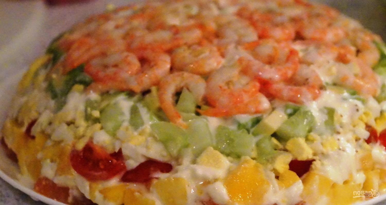 2. Креветки использую отваренные, затем очищаю их и укладываю нижним слоем в салатницу.