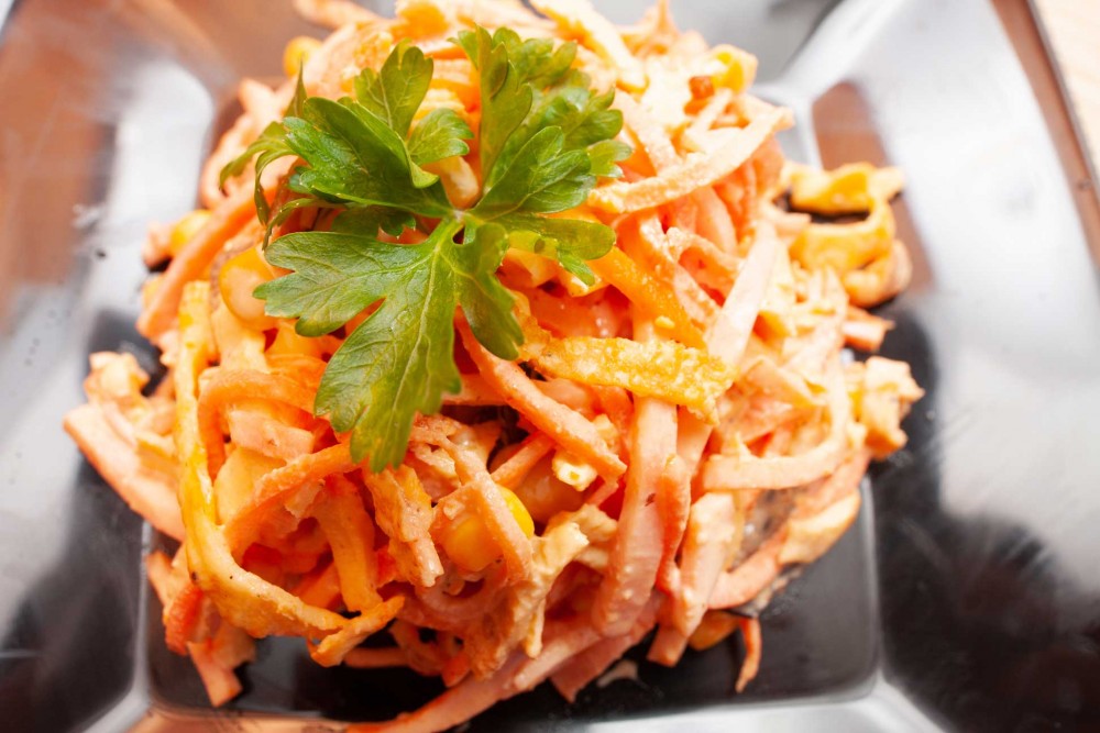 Убираем салат в холодильник часа на два. За это время палочки пропитаются морковным соком.