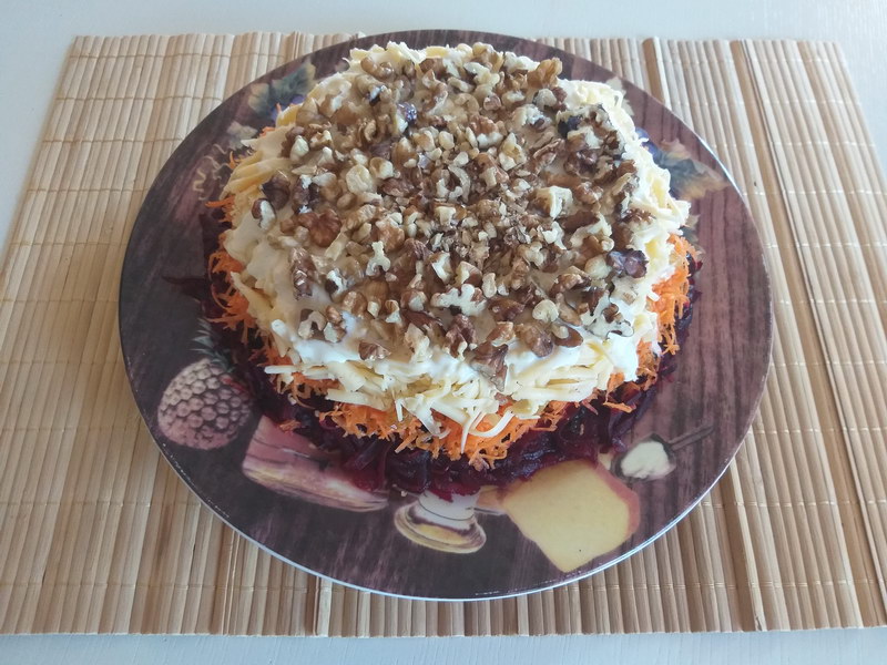 Свеклу отварить, очистить и натереть на крупной терке. Уложить первым слоем на блюдо.