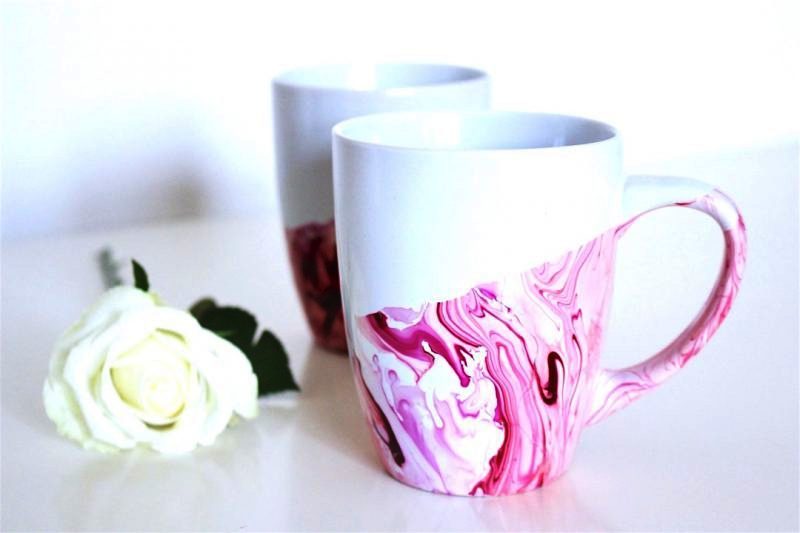 В большую миску налейте немного холодной воды. Сверху капните несколько капель лака для ногтей и при помощи обычной зубочистки немного растяните пятно по поверхности. Возьмите чашку за края и донышком погрузите в воду, прямо в центр пятна. Достаньте, переверните и дайте просохнуть. Оригинальная чашка готова.