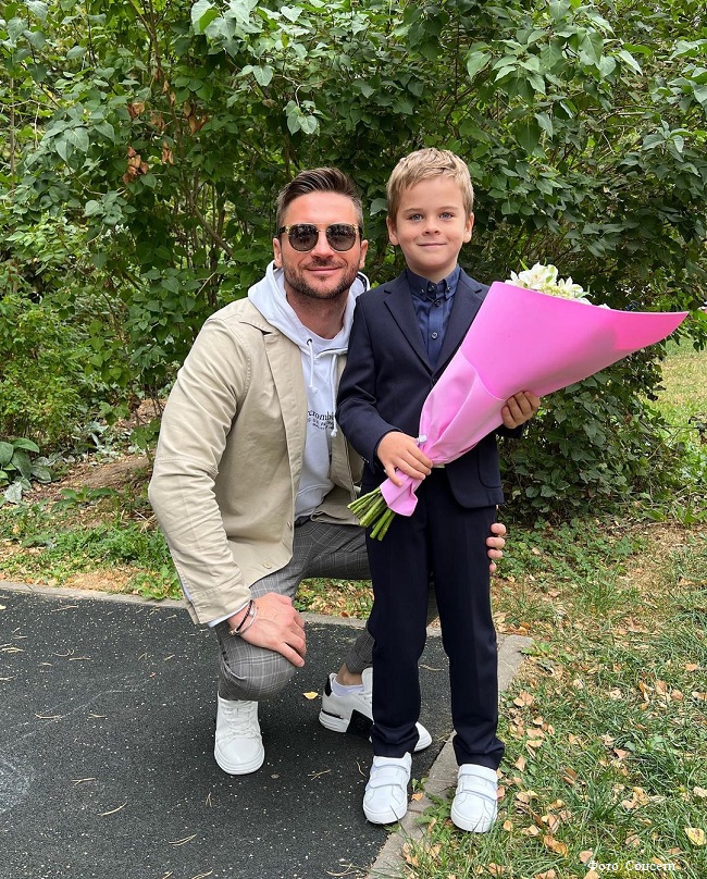 Отпрыск артиста красовался в темно-синем костюме, рубашке в тон и белых кедах, а в руках у него был небольшой букет для учительницы. Цветы вручили и 4-летней Ане, чтобы девочка не расстраивалась, раз ее пока не берут в школу.