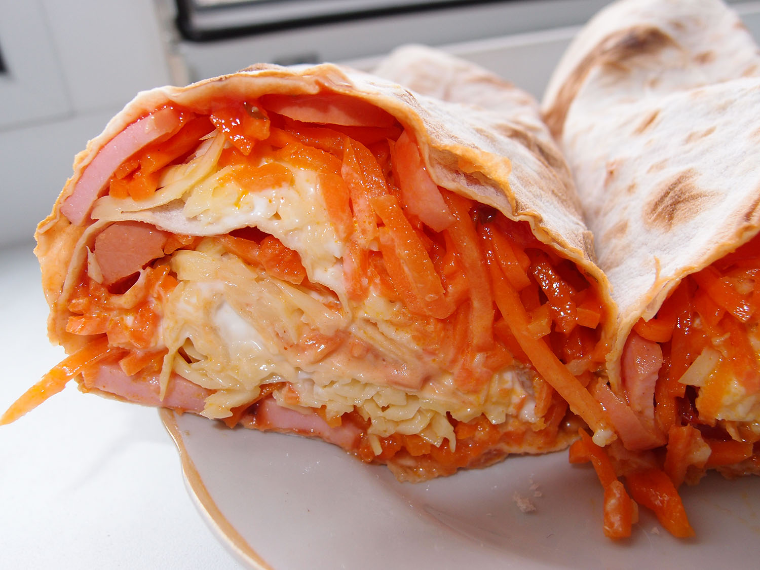 Заворачиваем лаваш в виде трубочки или удлиненного конвертика.