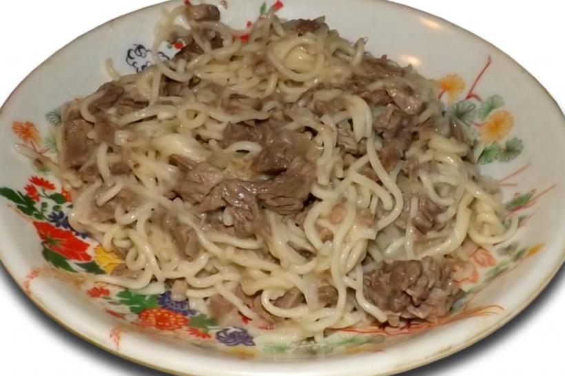 - Отдельно отваривают лапшу. Затем ее кладут в тарелку и заливают ее лагманом. Блюдо рекомендуется подавать горячим.