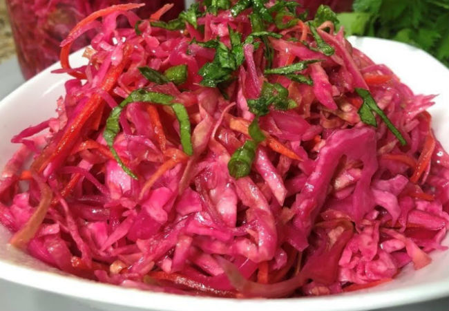 Максимальный вкус такой кремлевский салат приобретает ко вторым суткам. Но пробовать его можно сразу: капуста выходит хрустящей и пряной.