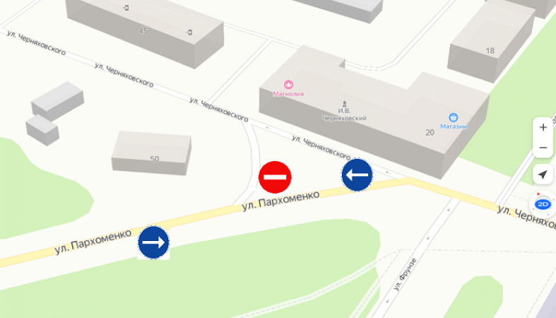 Изменения действуют в районе пересечения улиц Черняховского и Пархоменко. Съезд с Черняховского на Пархоменко около дома № 50 стал односторонним.