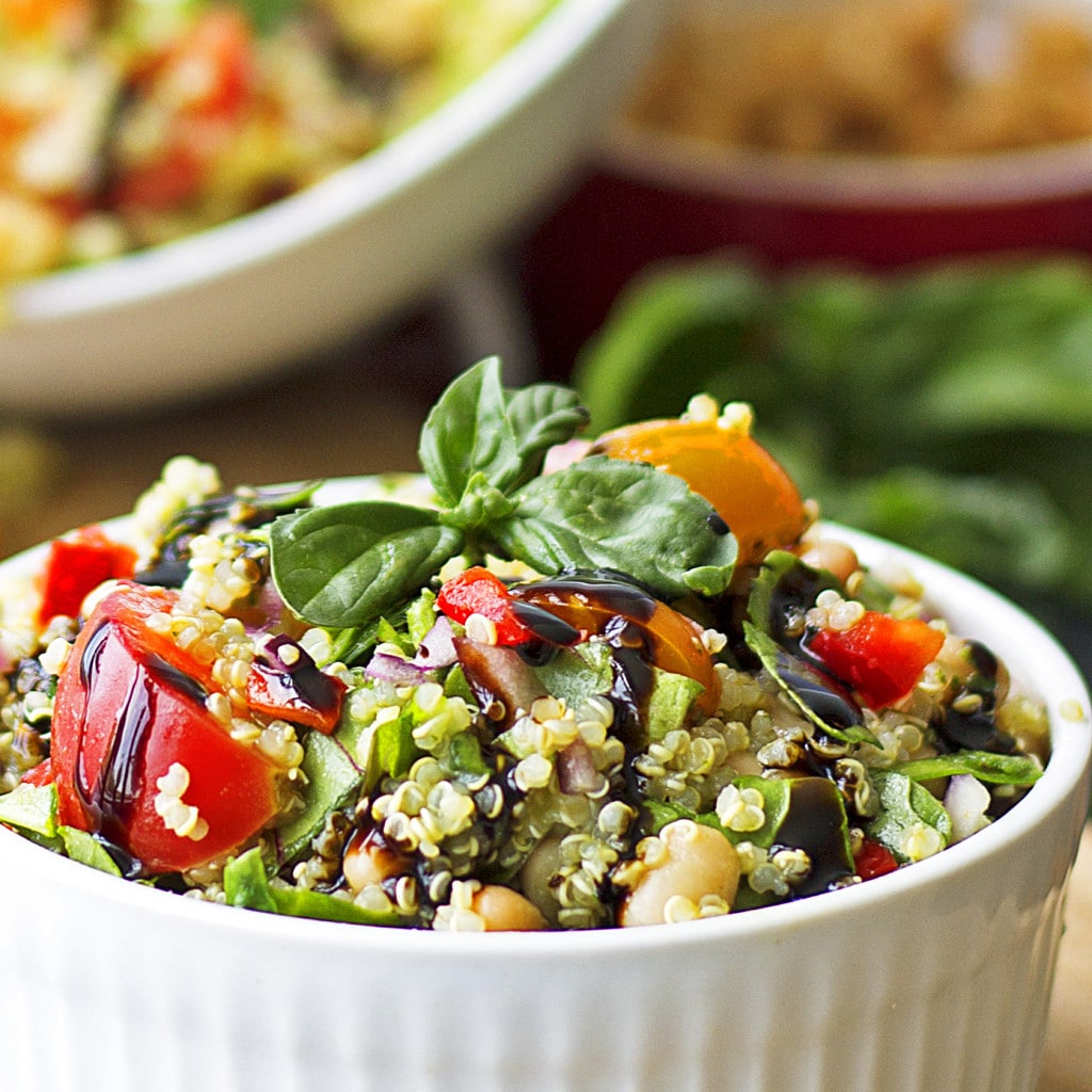 Что ещё надо знать о «секретиках» вкуснейшего салата? А! Вспомнила! Начните с приготовления киноа. Ключ к успеху — НИКОГДА не следовать инструкциям на упаковке, которые всегда требуют слишком много жидкости и приводят к полному размягчению семян. Идеальное соотношение — 1 стакан киноа к 1+ 2/3 стаканам жидкости (короче, два неполных стакана). Просто смешайте воду, соль и промытое киноа в кастрюле и доведите до кипения. Убавьте огонь до кипения, накройте кастрюлю крышкой и готовьте, пока киноа не будет готова, около 15 минут. Вы поймете, что это сделано, когда маленькие белые “хвостики” прорастут из зерен. Если вода будет выкипать особо интенсивно — добавите пару столовых ложек.