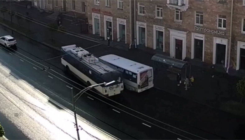 Маршрутный автобус стоял на остановке, подъехал троллейбус и стал его объезжать. Но желание встать впереди маршрутки подвело водителя электротранспорта.
