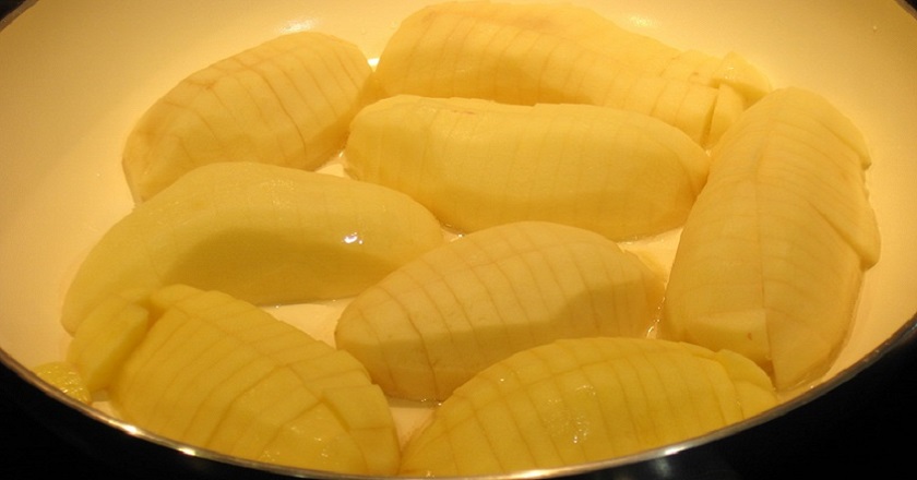 - Разогрейте подсолнечное масло в глубокой сковороде на среднем огне. Возьмите картофель и уложите каждую половинку срезом вниз. Подождите пару минут, убавьте огонь и накройте сковороду крышкой. Не солите картофель и не снимайте крышку. Примерно через 30 минут картофель станет румяным снизу, а сверху будет напоминать тушеный.