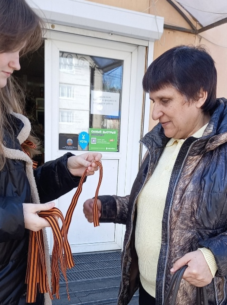 Акция по раздаче оранжево-черных лент в Лахденпохском районе стартовала в поселке Хийтола. Волонтеры дарят жителям поселка георгиевские ленты и рассказывают историю символа, показывают, как правильно его носить, обращая внимание на сохранность ленточки.