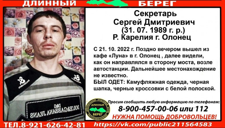 В Олонце ведут поиски 33-летнего местного жителя. По сообщению, опубликованному в на странице поисковиков ВК «Длинный берег», 21 октября поздно вечером Сергей Дмитриевич Секретарь вышел из кафе «Луна» и пропал.