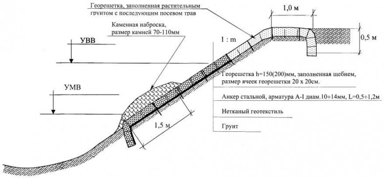 Для укрепления берега мы нашли решение: там будут устанавливать габионы матрасного типа, которые будут заполнены природным камнем, и георешетку. Над габионами на склоне будет сформирован усиленный георешеткой газон.