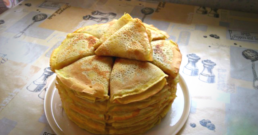 - Смазанную сковороду разогрейте. Налейте порцию теста, распределите. Посыпьте небольшим количеством картофеля и лука. Когда низ схватится и подрумянится, переверните блин. Готовые блины сложите в стопочку под крышку.