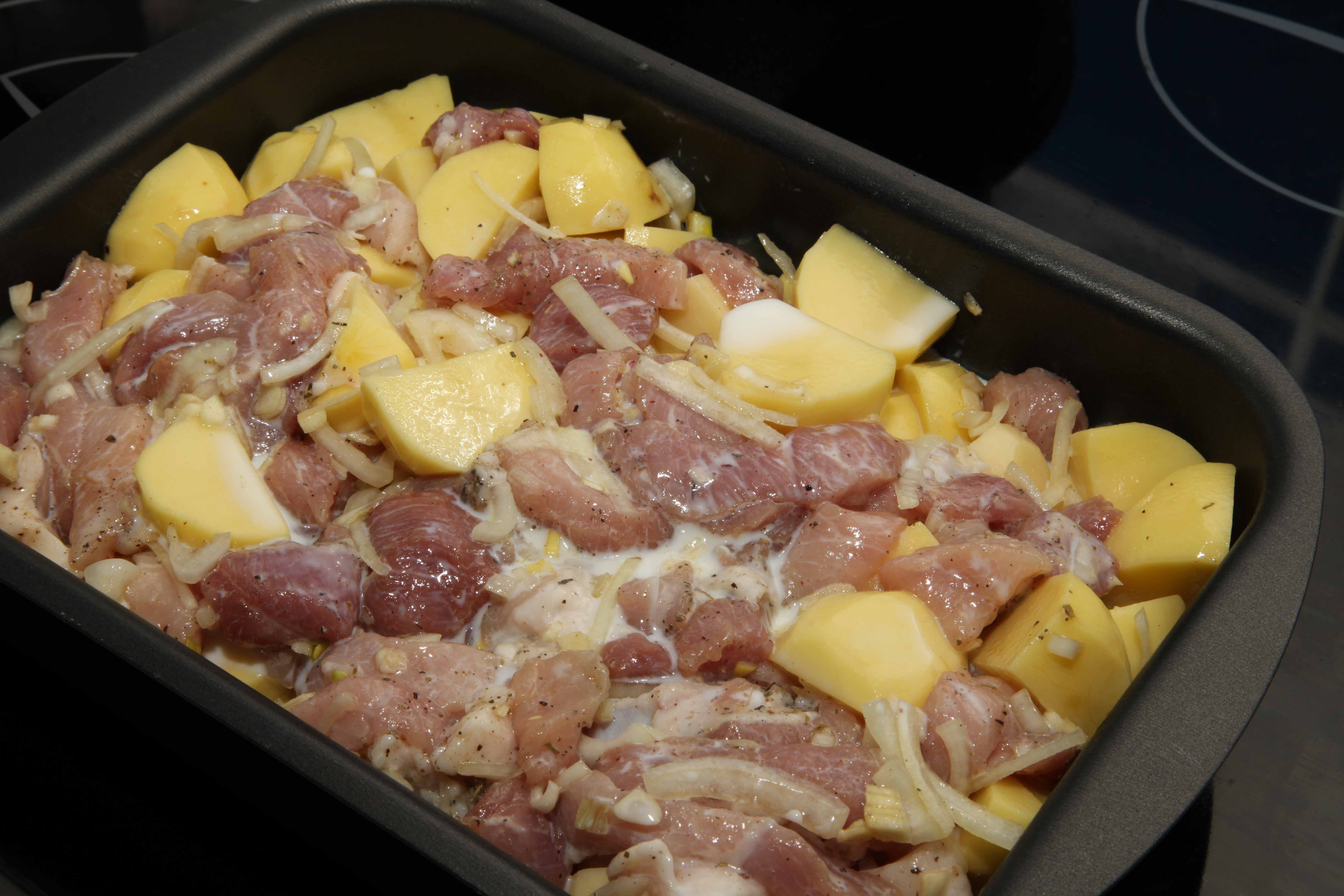Свинину порежьте небольшими кусочками, чуть толще чем будет нарезана картошка.