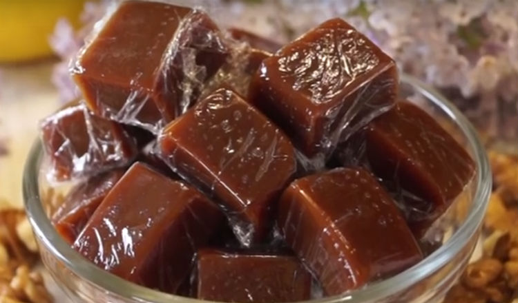 Осталось добавить в смесь сливочное масло, залить уже горячие сливки и еще немного поварить. Вот и все, те самые ириски из детства готовы!