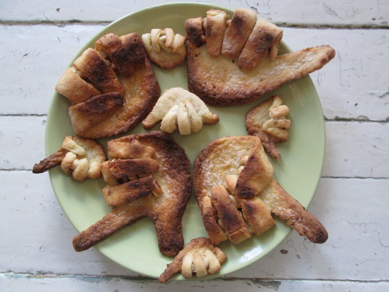Кусочек теста вымешиваем. Раскатываем скалкой пласт до ширины в 2-3мм. Вырезаем на тесте ладошки при помощи формы из пергаментной бумаги.
