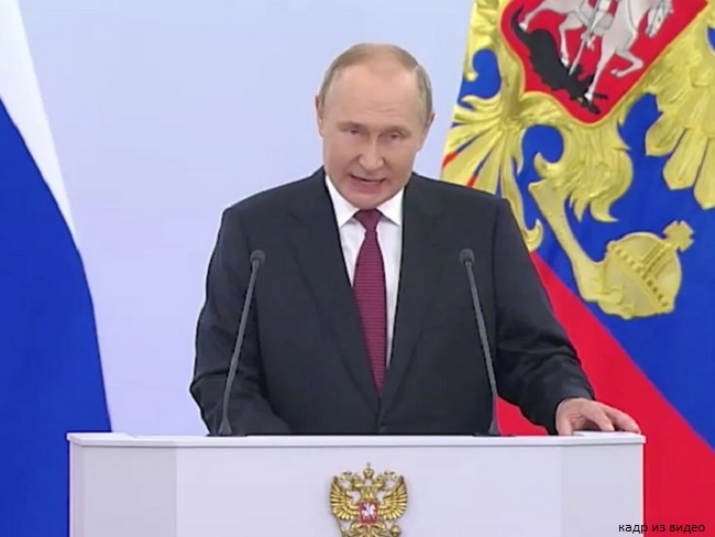Президент завершил выступление цитатой философа Ивана Ильина. «Мир вступил в период революционных трансформаций. Как прежде уже не будет. Поле битвы, куда нас привели судьба и история, это поле битвы за великую Россию. За большую историческую Россию! Сегодня мы сражаемся, чтобы никому и никогда не пришло в голову, что нашу культуру и историю можно взять и вычеркнуть! За нами правда, за нами — Россия!» — заявил он. После этого был подписан договор о вхождении ДНР, ЛНР, Херсонской и Запорожской областей в состав России.