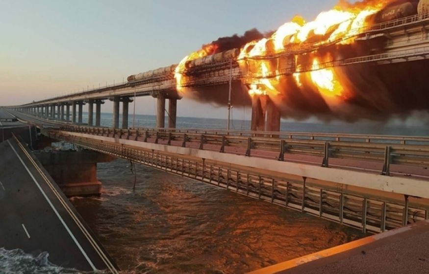 8 октября на железнодорожном мосту через Керченский пролив произошел взрыв, в результате обрушилась часть автомобильного моста. Загорелись несколько цистерн с топливом, движение автомобилей и поездов по мосту было приостановлено.