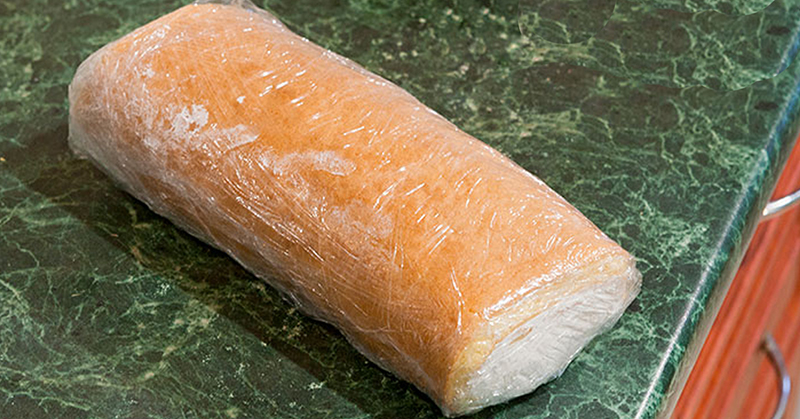 - Сверни рулет, обмотай пищевой пленкой, чтобы блюдо не потеряло форму, и отправляй в холодильник на 2 часа. За это время рулет пропитается и охладится. Приятного аппетита!