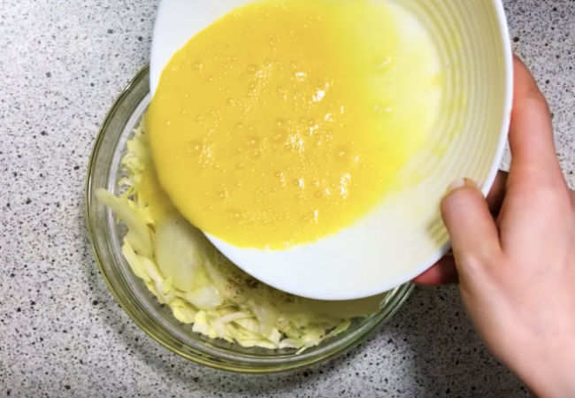 Теперь взбалтываем в миске три яйца и выливаем их в миску на капусту с луком. Добавляем 80 граммов муки, перемешиваем ложками — мука нам нужна только для густоты и скрепления всех ингредиентов.