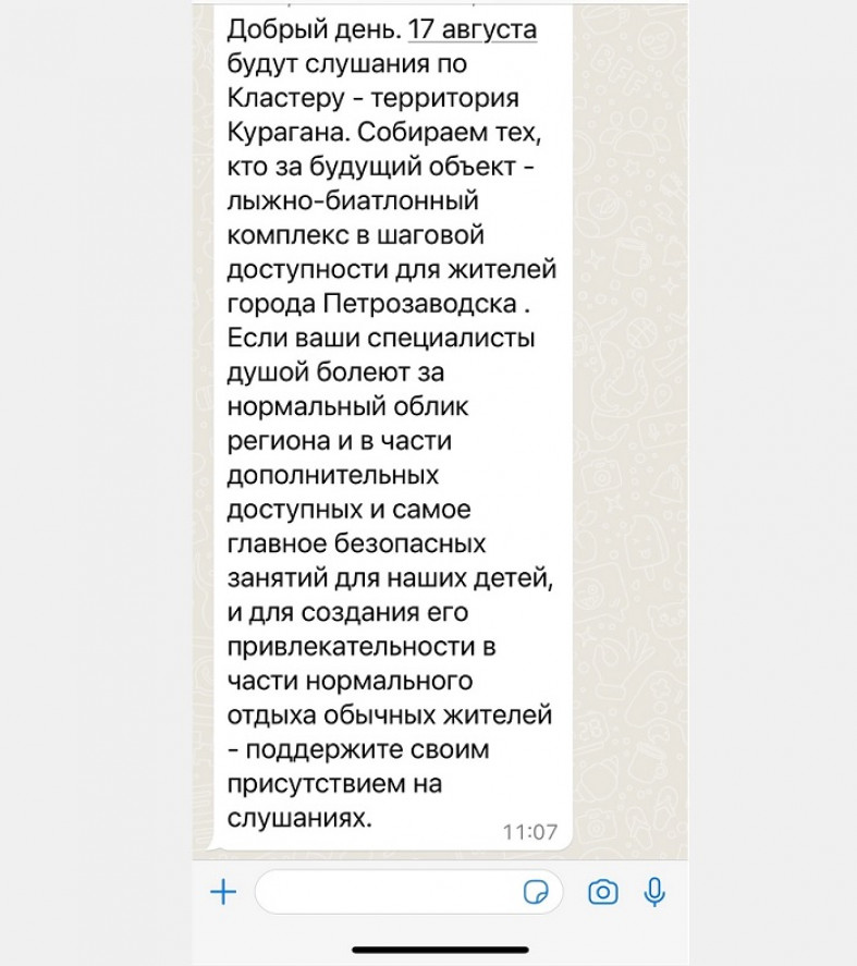 Судя по тексту, на слушания приглашают лояльно настроенных горожан, которые поддерживают строительство лыжно-биатлонного комплекса на Кургане, болеют душой «за нормальный облик региона». В сообщении упор сделан на доступные и безопасные занятия детей и нормальный отдых петрозаводчан.