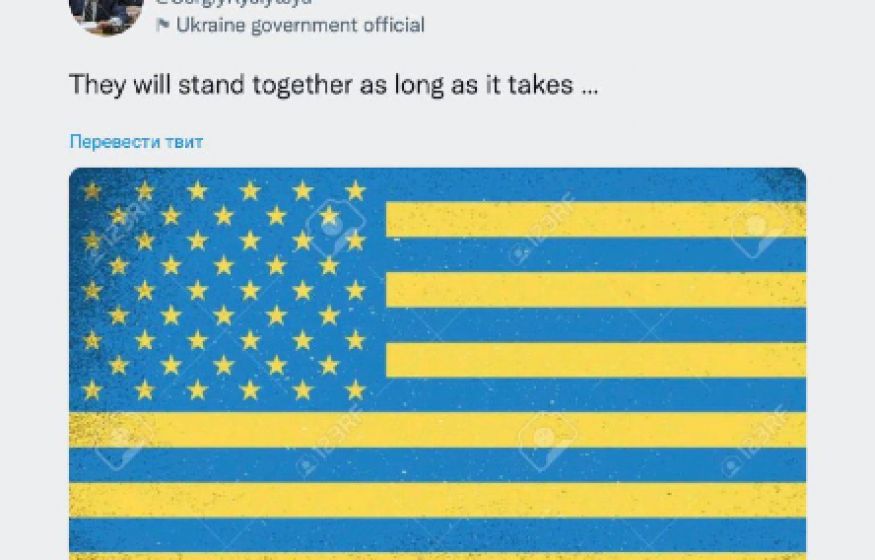 Ранее постоянный представитель Украины в ООН в своем «Twitter» (соцсеть заблокирована на территории России) опубликовал макет нового украинского флага. Примечательно, что он, по факту, представляет собой аналог флага Соединенных Штатов Америки, но исполнен в желто-синих цветах.