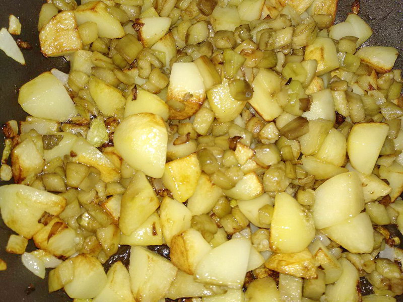 На половину готовые баклажаны добавляем к картофелю с луком. Жарим до готовности.