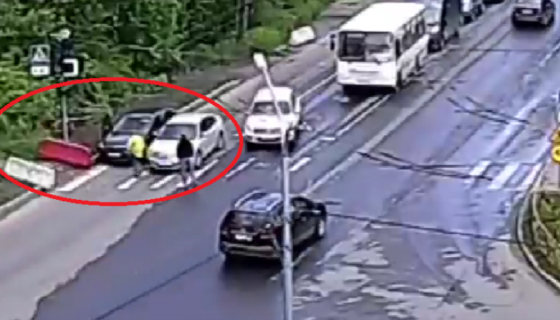 Сегодня утром две легковушки столкнулись в Петрозаводске, пропуская женщину-пешехода. Она внезапно буквально бросилась под одну из них, видео разместили в группе «Подслушано у водителей ПТЗ и Карелии».
