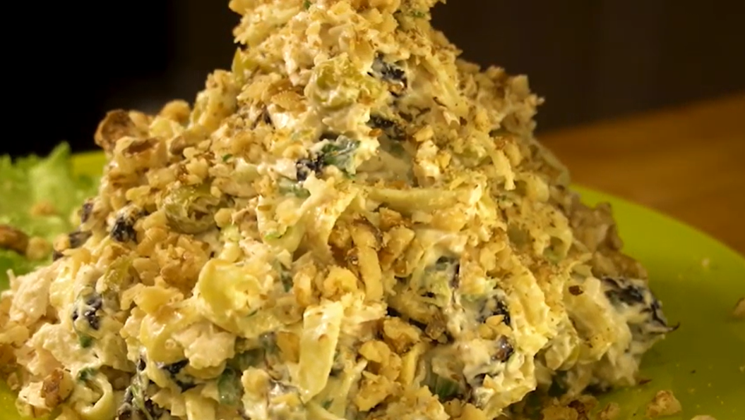 Добавьте немного волшебства в предновогоднее меню! В этой закуске смелое сочетание привычных ингредиентов гармонично дополняется вкусом витаминных сухофруктов и измельченных орехов. Связующее звено – майонез, который гармонично подчеркивает не только вкус, но и текстуру мяса.